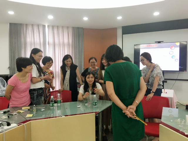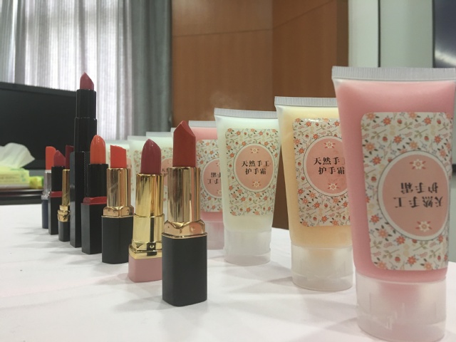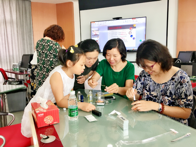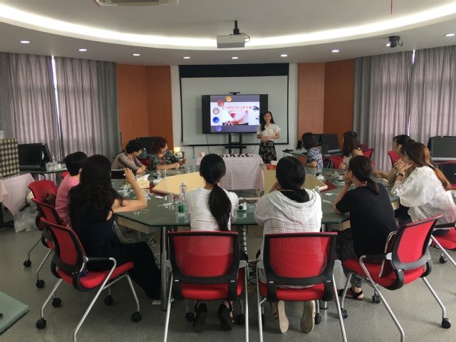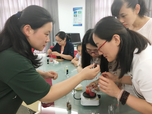 DIY达人欧阳老师首先展示了自己手工制作的口红样品,然后通过PPT介绍了口红制作的原料和工具,详细讲解了制作流程。参加活动的教师们在欧阳老师的指导和介绍下纷纷挑选了自己最喜欢的口红粉颜色瓶以及口红管,开始了制作。用消毒纸巾给烧杯和口红管还有研磨刷消毒,将口红粉、油脂、蜂蜡放入烧杯混合、研磨并加热,加入维生素E和少许精油,然后快速将搅拌均匀的膏体倒入模具放入冰箱。在等待口红膏体凝固成型的过程中,欧阳老师又指导了教师们进行护手霜的制作。差不多二十分钟左右,教师们急不可耐的把自己的口红模具从冰箱里取出,在欧阳老师的指导示范下把准备好的口红管轻轻插入膏体,缓缓拔出,一支用健康天然材料制作、属于自己独一无二限量版的口红就制作好了。