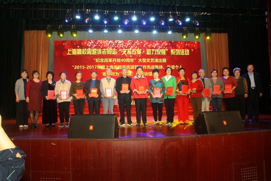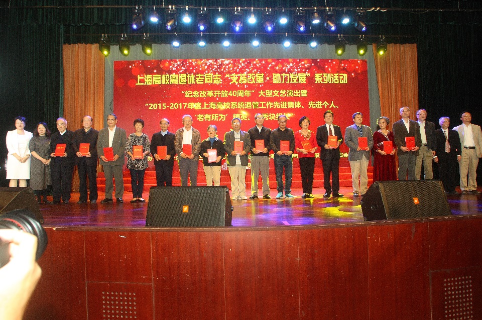 为树立楷模、弘扬先进,进一步激励上海高校系统退管工作部门和退管工作者奋发进取,再创佳绩,推进高校退管服务工作的深入发展,近日,由上海市教卫党委老干部处、上海市高校退管会联合主办的上海市高校系统 “庆祝改革开放40周年”大型文艺演出暨2015--2017年度先进集体与先进个人表彰大会在上海交通大学隆重举行。