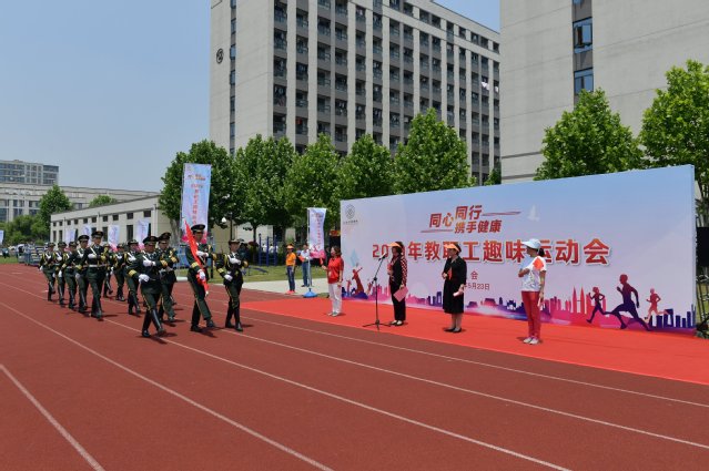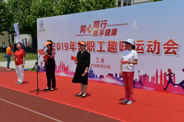 2019年5月23日,在阳光明媚的日子,喜迎新中国成立70周年和建校四周年之际,以“同心同行,携手健康”为主题的2019年教职工趣味运动会在南苑运动场举行。教职工们满怀喜悦的心情,以精神饱满的姿态,欢聚一堂,在各相关职能部门及部门工会的支持下,历经2周的筹划、组织、实施,迎来了今天趣味运动会的顺利召开。党委书记、工会主席郑沈芳,副校长唐红梅,工会常务副主席凌文惠出席开幕式。开幕式由唐红梅副校长主持,郑沈芳书记致开幕辞。21个部门工会在学院及职能部门党政负责人、主席及委员带领下的教工代表队有序站列,学生仪仗队的同学在嘹亮的口号声中入场,进行庄严的升旗仪式,全场肃立,教职工面对国旗,手拿小红旗,高唱国歌。随后工会兼职副主席、体育教学部书记郁建新代表运动员、裁判长代表裁判员们宣誓。
