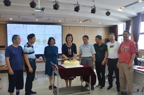 在热烈的掌声和音乐声中,一只象征着甜蜜、圆满的大蛋糕推到会场,到场的老师共同祝福退休教职工“荣退快乐!”。