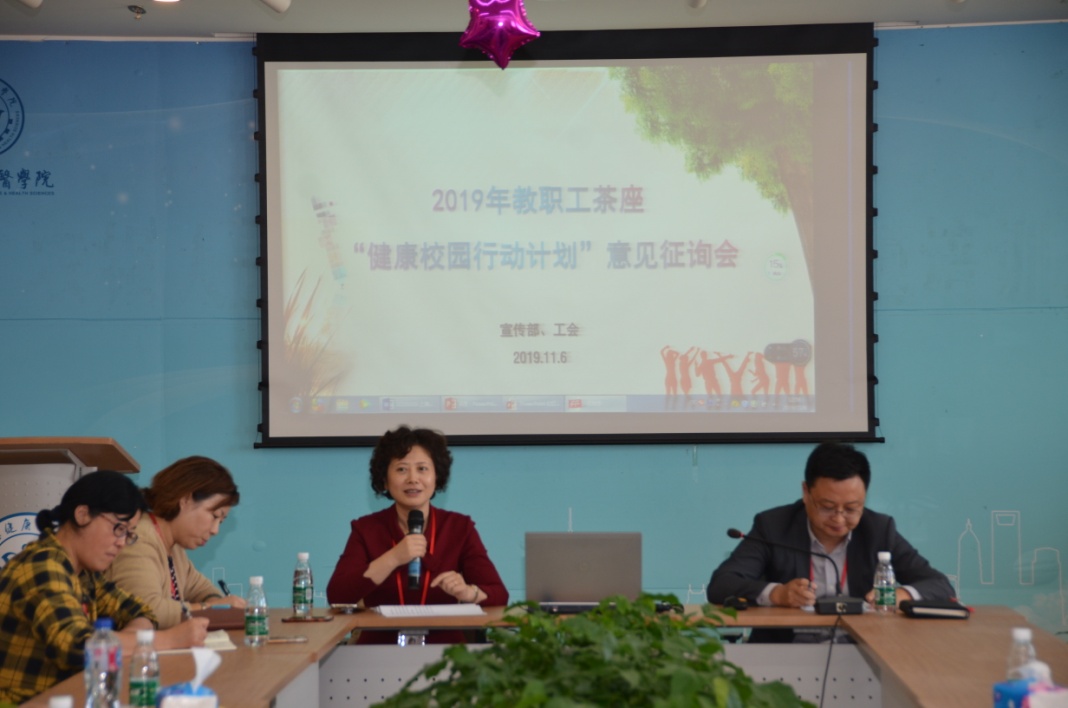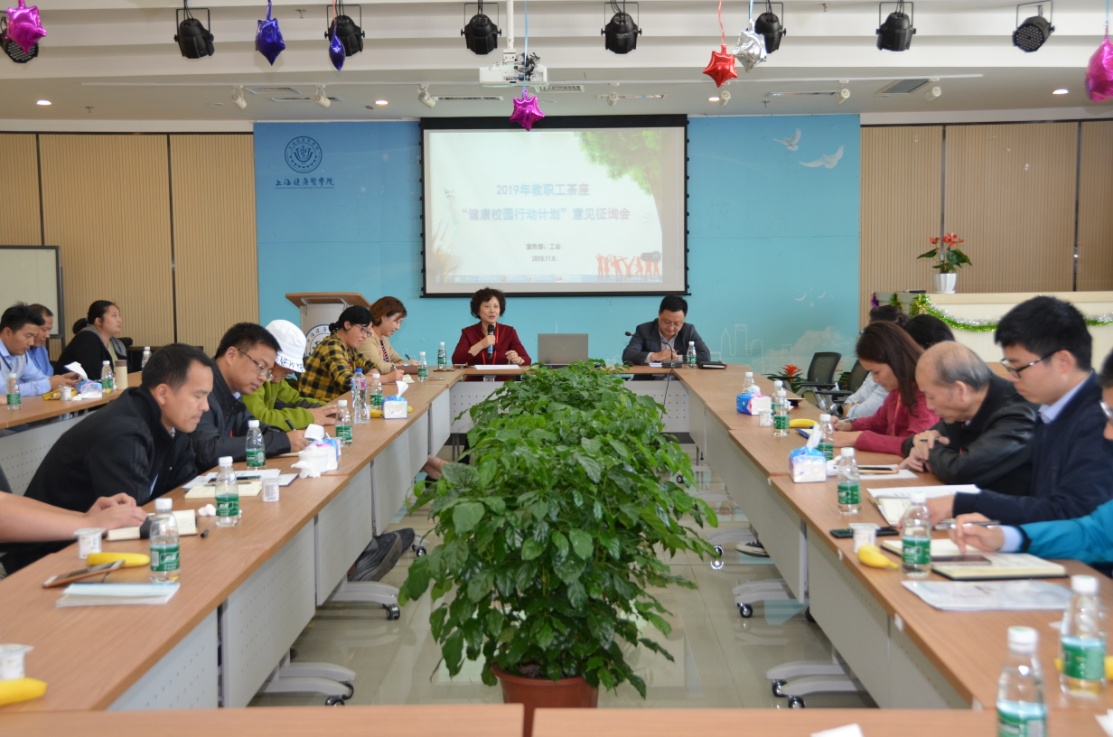 为深入学习和贯彻习近平新时代中国特色社会主义思想,主动承担起建设“健康中国”、“健康上海”的重要使命,积极响应健康中国、健康上海行动,并将其作为上海健康医学院的宣言书、承诺书和任务书,全力实施健康校园行动计划,结合我校实际情况,由宣传部牵头,制定了我校“健康校园行动计划”,并在第五届师生运动会上举行了启动仪式。为了进一步完善“健康校园行动计划”,宣传部联合校工会,利用教工茶座这个平台,进行意见征询。副校长唐红梅,宣传部、组织部、基建处、后勤服务中心、学生处、心理健康中心、体育教学部等负责人及各部门工会教师代表50余人出席会议,会议由工会常务副主席凌文惠主持。
