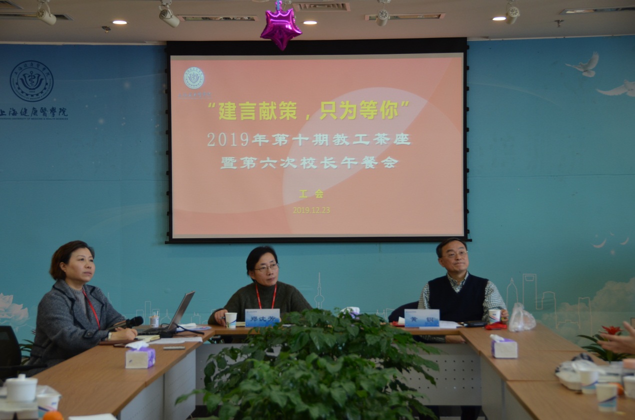 为了及时了解教职工在学校发展中对专业建设、科研、学生管理和推进“三圈三全十育人”等方面的建议意见,加强教职工与校领导及职能部门的交流沟通,共同推进学校校务公开、民主管理工作,会前由各学院、部门教师代表围绕主题进行意见征询。2019年12月23日中午,在南苑7号楼403会议室召开2019年第十期教工茶座暨第六次校长午餐会,党委书记、工会主席郑沈芳,校长黄钢,校办、教务处、科技处、人事处、学工部、教师工作部、后勤服务中心等部门负责人及我校各部门教师代表40多余人出席会议。会议由工会常务副主席凌文惠主持。
