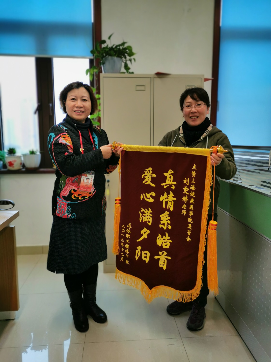 12月20日上午,体育教研室退休教师褚林书委托儿子向学校送来一面锦旗,锦旗上写着“真情系皓首,爱心满夕阳”。以此表达褚林书老师及其家人对校退管会办公室主任刘雯婷老师热情周到服务、关心关爱老同志的感激之情。