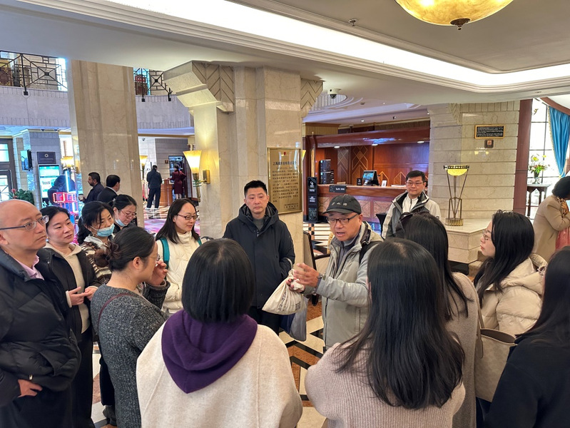 随着《繁花》的播出,剧中出现的许多上海地标已成新晋热门打卡点。在这些地标中,从象征上海昔日荣耀的“国际饭店”,到曾灯火通明、人声鼎沸的“黄河路入口”;从藏匿市井百态的“苔圣园酒家”,到重焕新生的“长江剧场”;从承载几代人衣着记忆的“上海时装商店”,到见证风云变幻的“和平饭店”;最终抵达外滩万国建筑群中的“外滩27号”,并驻足于横跨苏州河的“外白渡桥”之畔。老师们聆听着导游的专业介绍,沉浸其中,影视画面与眼前实景相互印证,仿佛在用脚步重温一部立体的《繁花》。感受市井烟火,品味上海文化,更是体会了从《繁花》到繁华的历史变迁。
