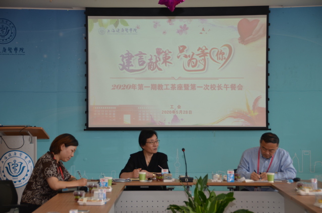迎来学校建校5周年之际, 校工会于5月28日中午在南苑七号楼403多功能会议室举办2020年度第一次校长午餐会暨教工茶座。党委书记、工会主席郑沈芳,校长黄钢,党校办、组织部、宣传部、纪委办、人事处、教务处、产学合作处、学工部、规划处、科技处、国际交流处、后勤服务中心、图书馆负责人和部分教代表50余人出席茶座,会议由工会常务副主席凌文惠主持。