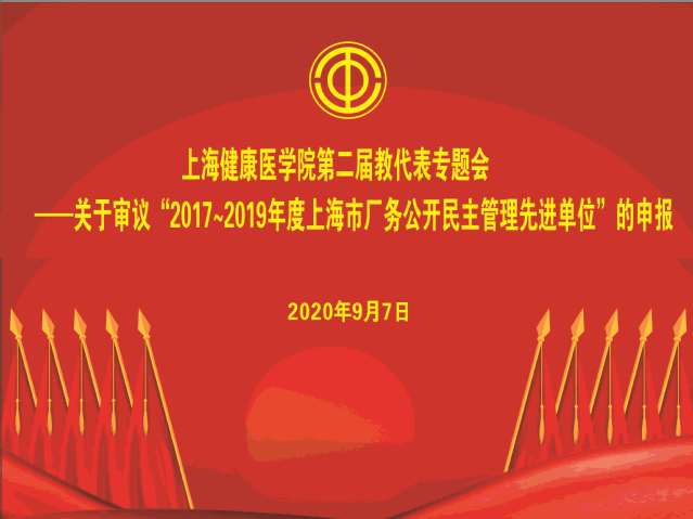 在抗击疫情常态化的形式下,学校师生迎来了新学期的开学。9月7日在1号楼1楼200人报告厅上海健康医学院第二届教职工代表专题会议 —— 关于申报“2017~2019年度上海市厂务公开民主管理先进单位”的审议会议在线上顺利召开,校领导及全体教代表123人参加会议。