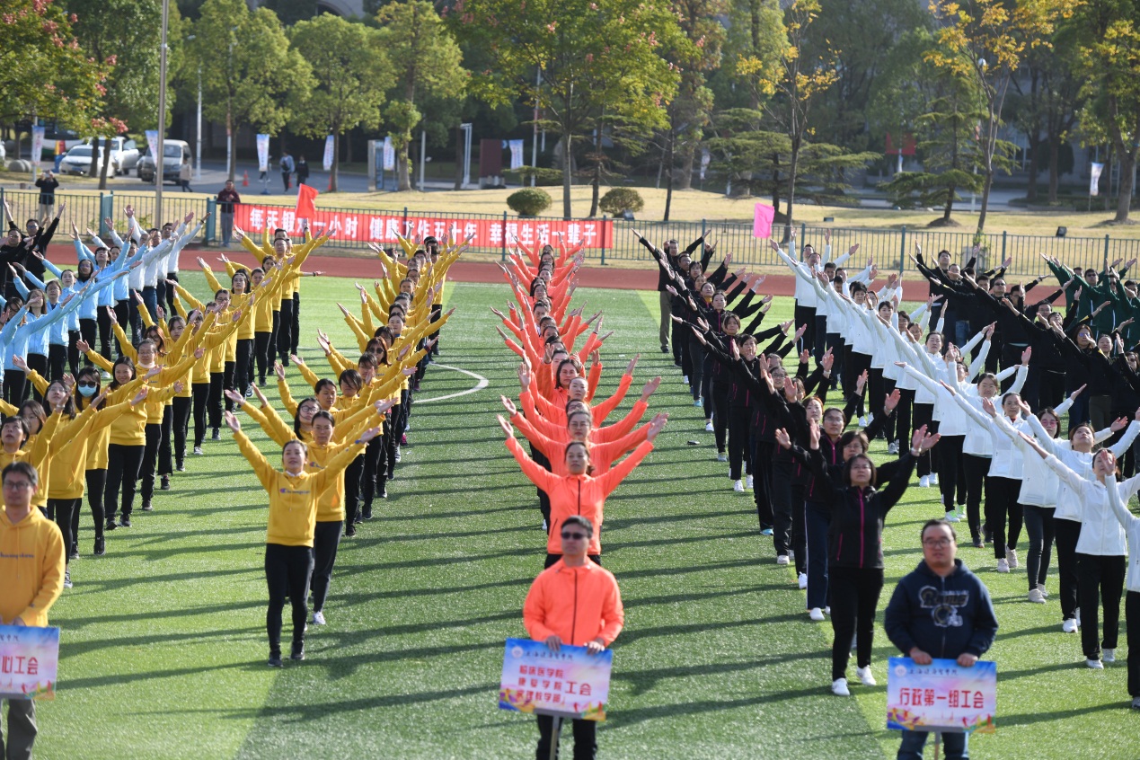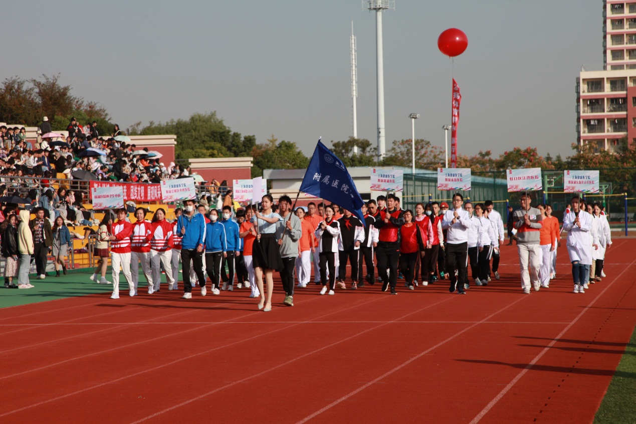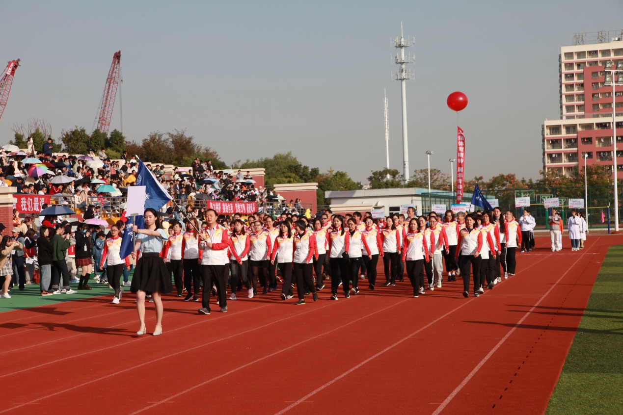 为全面贯彻党的教育方针与《全民健身计划》,落实《学校体育工作条例》和《高等学校体育工作基本标准》相关要求,促进师生体质健康水平不断提升,全面展示乐观向上和追求卓越的精神风貌,增强荣誉感和归属感。2020年10月23日,迎着秋日的阳光,我校第六届师生运动会在北苑操场顺利举行。22个部门工会在学院及职能部门党政负责人、部门工会主席等带领下积极参与到运动会的各项活动及赛事中, 上海市第六人民医院东院、嘉定区中心医院、浦东新区周浦医院、浦东新区人民医院、联新国际上海禾新医院、崇明区中心医院、上海市第六人民医院金山分院、第一康复医院、杨浦区精神卫生中心的医务员工代表当天也前来参加入场式、广播操展示及各类比赛项目。