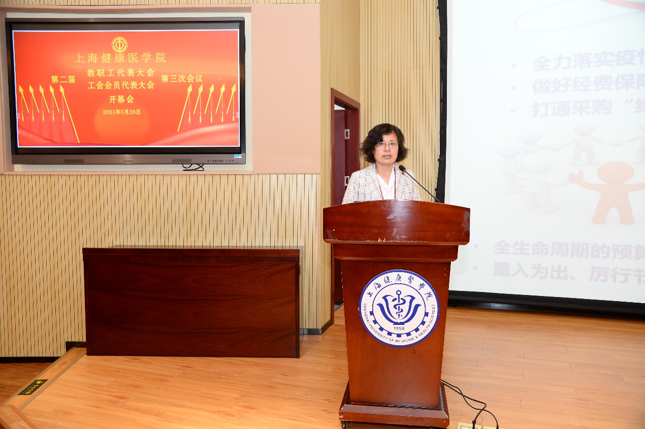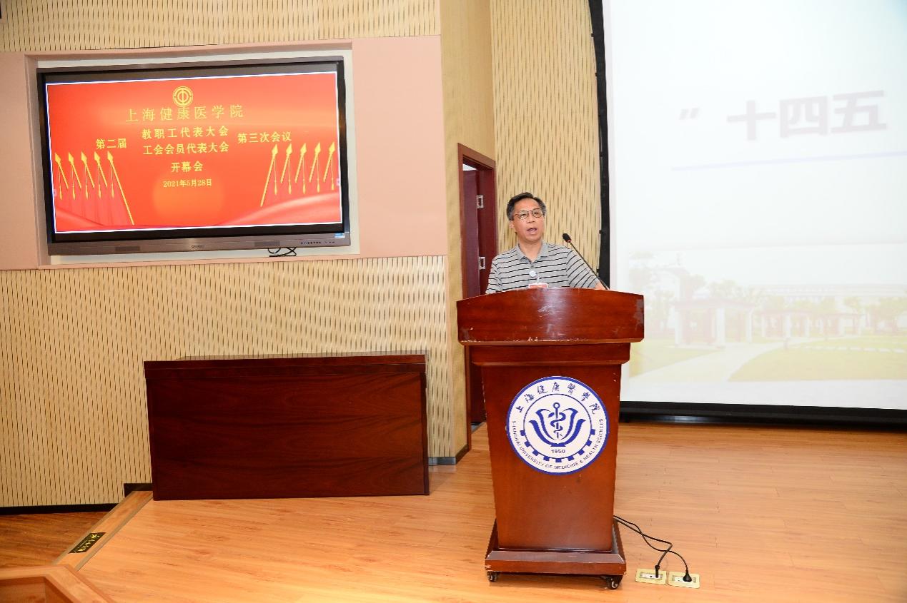 首先,吴韬作《2020年度学校工作总结和2021年度学校工作思路 》的报告。他从全面从严治党、疫情防控、学生培养质量的提升、专业内涵建设、教师队伍建设、发展规划布局、拓展办学合作空间、 加强学校治理体系建设和凝心聚力共促发展九方面回顾了2020年学校工作。吴韬指出,2020年面对新冠疫情,全体教职工积极的迎难而上,确保了学校教学科研管理工作的顺利开展,展现了上健医人勇于担当、使命所趋的责任和风采。他强调,2021年重点做好以下六方面工作:一、全面加强党对高校的领导,坚持中国特色社会主义办学方向;二、坚守立德树人根本任务,全面提高人才培养质量;三、健全人事制度体系,造就一流人才队伍;四、打造特色鲜明的学科体系,提升科研产出能力;五、强化交流合作能力,增强社会服务效能;六、保障各项工作有条不紊,建设智慧绿色安全校园。2021年学校将继续服务“健康中国”、“健康上海”战略,贯彻“人民城市人民建、人民城市为人民”的理念,紧紧依靠广大教职员工,全面推进“十四五”建设,加快建设服务人民健康的高水平应用技术型医学院校,以优异成绩向建党一百周年献礼。