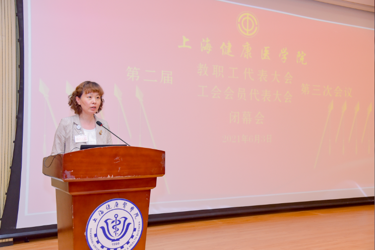 6月3日下午,上海健康医学院第二届教代会暨工代会第三次会议闭幕会在北苑1号楼200人报告厅隆重举行。党委书记郭永瑾,党委副书记、校长吴韬,党委副书记、纪委书记李明磊,党委副书记、副校长唐红梅,党委副书记于莹,副校长陈小冰、沈国芳、孔宪明、原校长黄钢以及110多名代表出席会议。列席大会的有部分职能部门负责人、民主党派代表等。闭幕会由于莹主持。