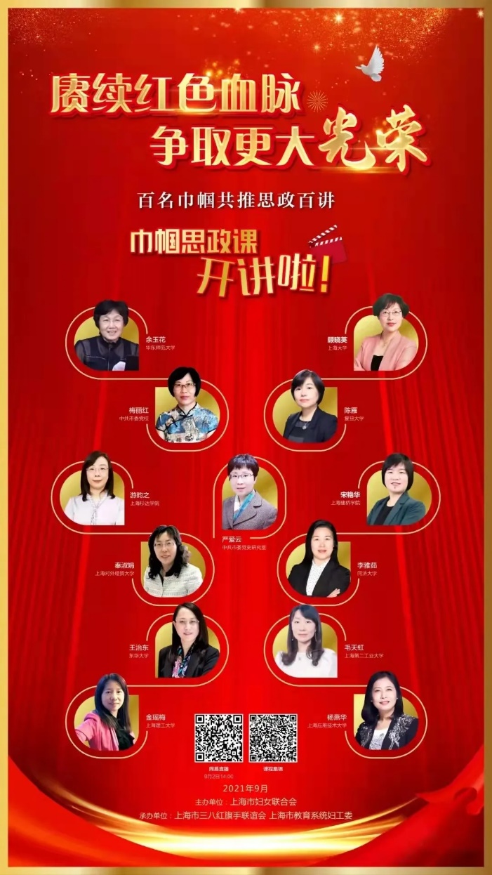 9月2日下午,由上海市妇联主办的“赓续红色血脉 争取更大光荣”——百名巾帼共推思政百讲活动正式启动。我校组织妇工委委员和女教师在线收看了首场宣讲。