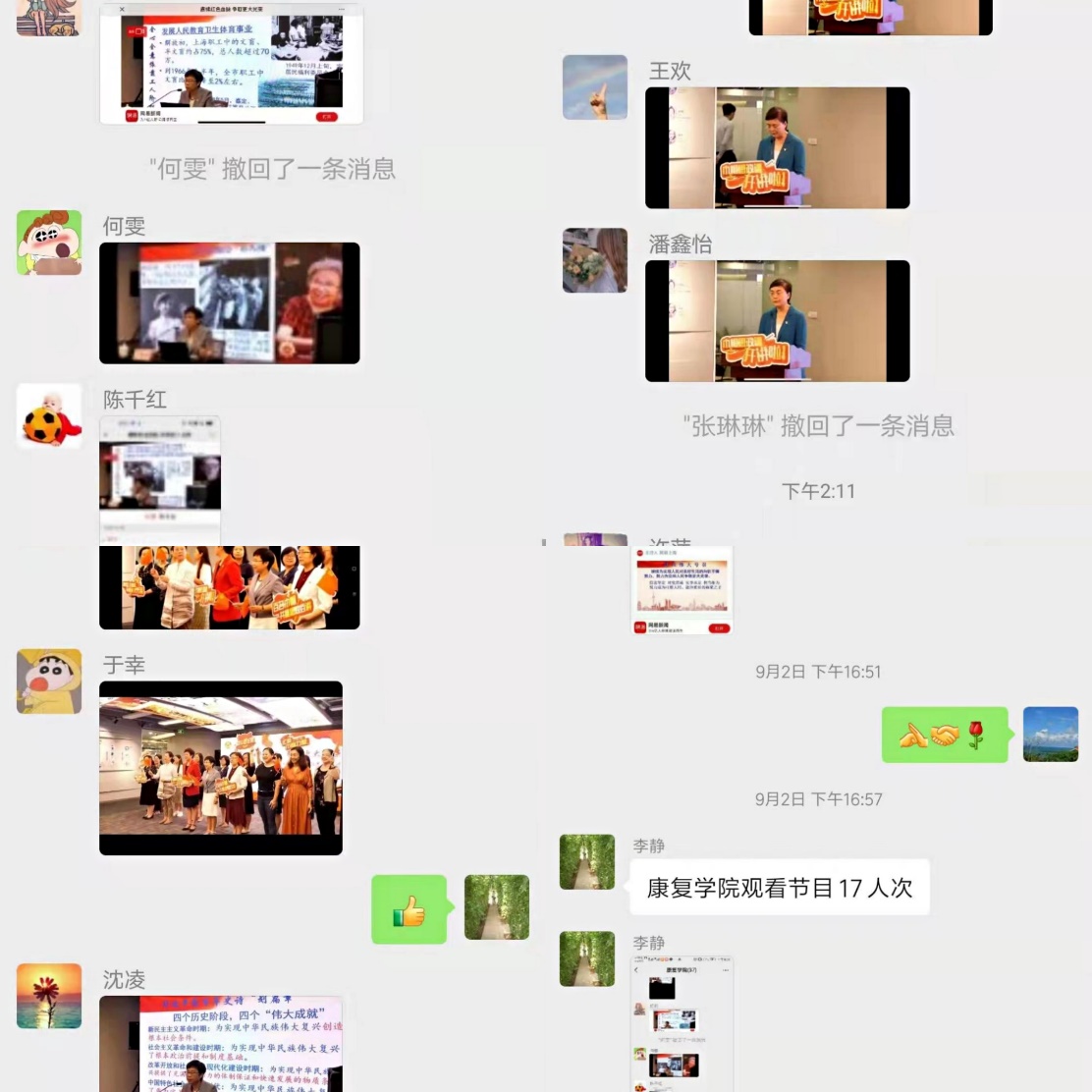 虽然正值暑期,但在校妇委会的通知和组织下,妇女干部和广大女教职工热情参与,尤其是康复学院就有17位女教职工纷纷上传线上收看视频的截屏,并表达了作为新时期人民教师将继续弘扬光荣传统、赓续红色血脉的决心。